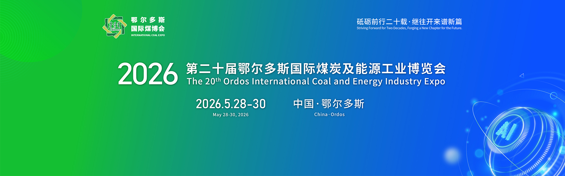 以“人工智能引领煤炭安全绿色开采”为主题的第二十届鄂尔多斯国际煤炭及能源工业博览会定于2026年5月28日至30日在鄂尔多斯市东胜区全民健身活动中心隆重举行。