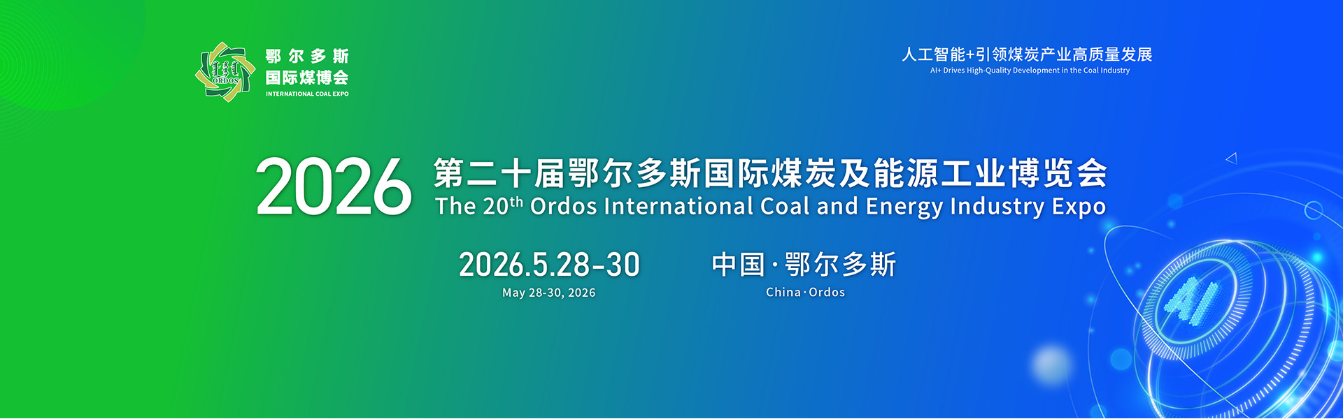 以“人工智能+引领煤炭产业高质量发展”为主题的第二十届鄂尔多斯国际煤炭及能源工业博览会定于2026年5月28日至30日在鄂尔多斯市东胜区全民健身活动中心隆重举行。