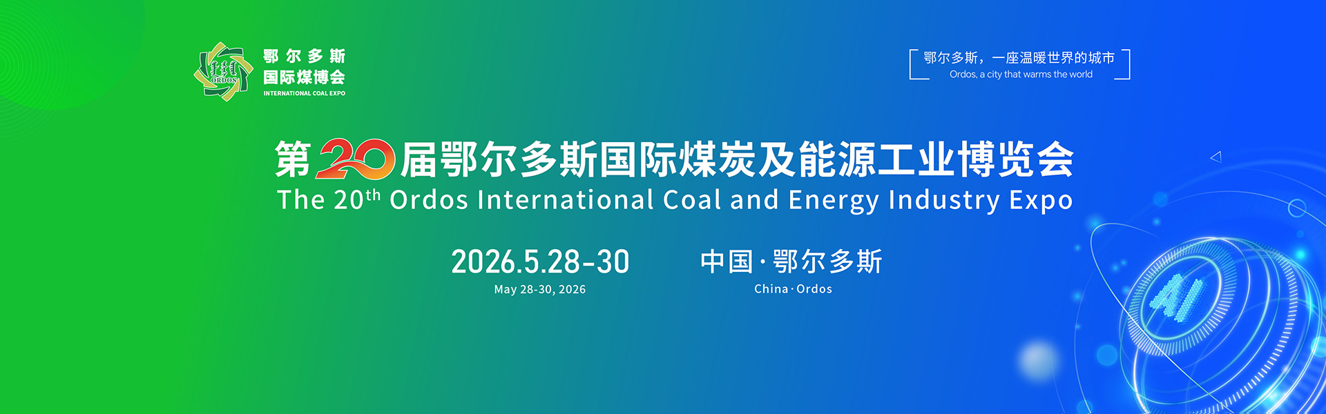 以“Ai赋能,助推煤炭产业高质量发展”为主题的第二十届鄂尔多斯国际煤炭及能源工业博览会定于2026年5月28日至30日在鄂尔多斯市东胜区全民健身活动中心隆重举行。